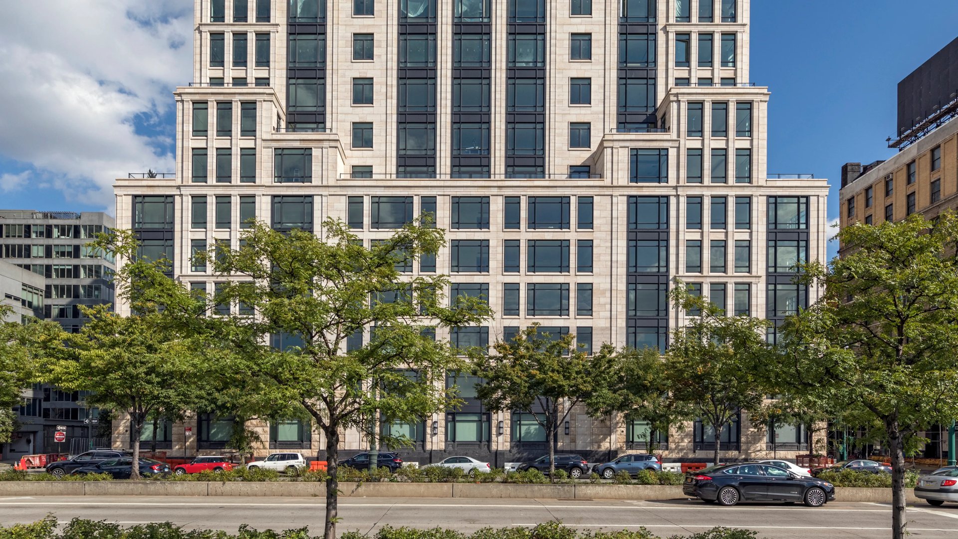The building’s limestone façade, gently pink-toned and hand-finished, evokes the material richness of prewar New York while introducing subtle modern articulation. The structure steps toward the Hudson, creating private terraces and framed views that shift with the light.